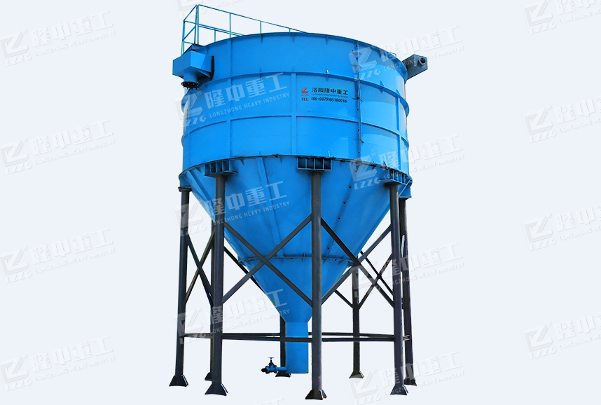處理物料的廢水經(jīng)過料道進入中心進料筒,并經(jīng)過緩流、絮凝等一系列作用,使增稠的底流泥漿由罐體底部的出料口排出,并進入壓濾機等其他設(shè)備,壓濾成泥餅。罐體上部產(chǎn)生清潔度較高的清水(溢流澄清液),由頂部的出水口排出,清水可循環(huán)利用,實現(xiàn)生產(chǎn)廢水零排放。